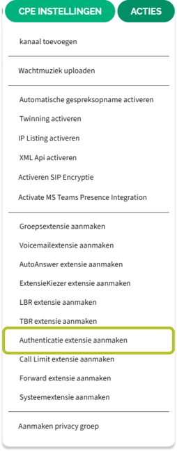 | Stap 4: Call-limit extensie aanmaken Klik vervolgens op Acties (rechts bovenin het scherm). Nadat je op acties hebt geklikt verschijnen er een aantal opties. Kies voor de optie Authenticatie extensie aanmaken (zie afbeelding) |