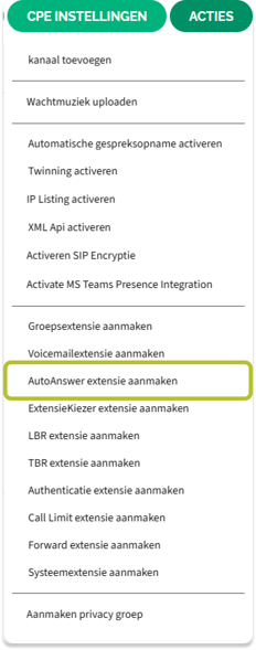 | Stap 4: Call-limit extensie aanmaken Klik vervolgens op Acties (rechts bovenin het scherm). Nadat je op Acties hebt geklikt verschijnen er een aantal opties. Kies voor de optie Autoanswer extensie aanmaken (zie afbeelding) |