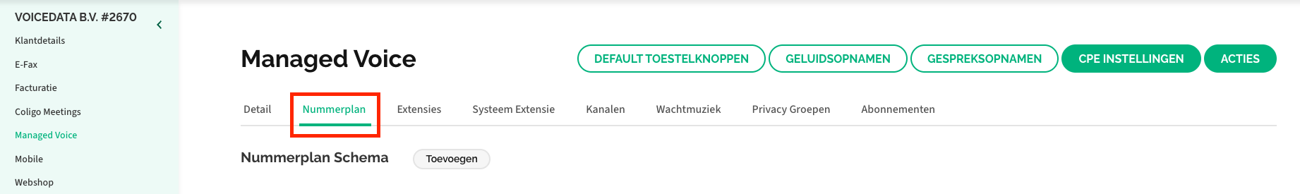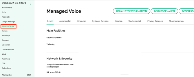 Klik op Klantconfiguratie en vervolgens in het linkermenu op Managed Voice om op deze pagina terecht te komen.