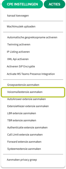 Stap 4: Klik op Acties en Voicemailextensie aanmaken Je komt in het volgende scherm terecht. Klik op Acties en vervolgens op Voicemailextensie aanmaken. |