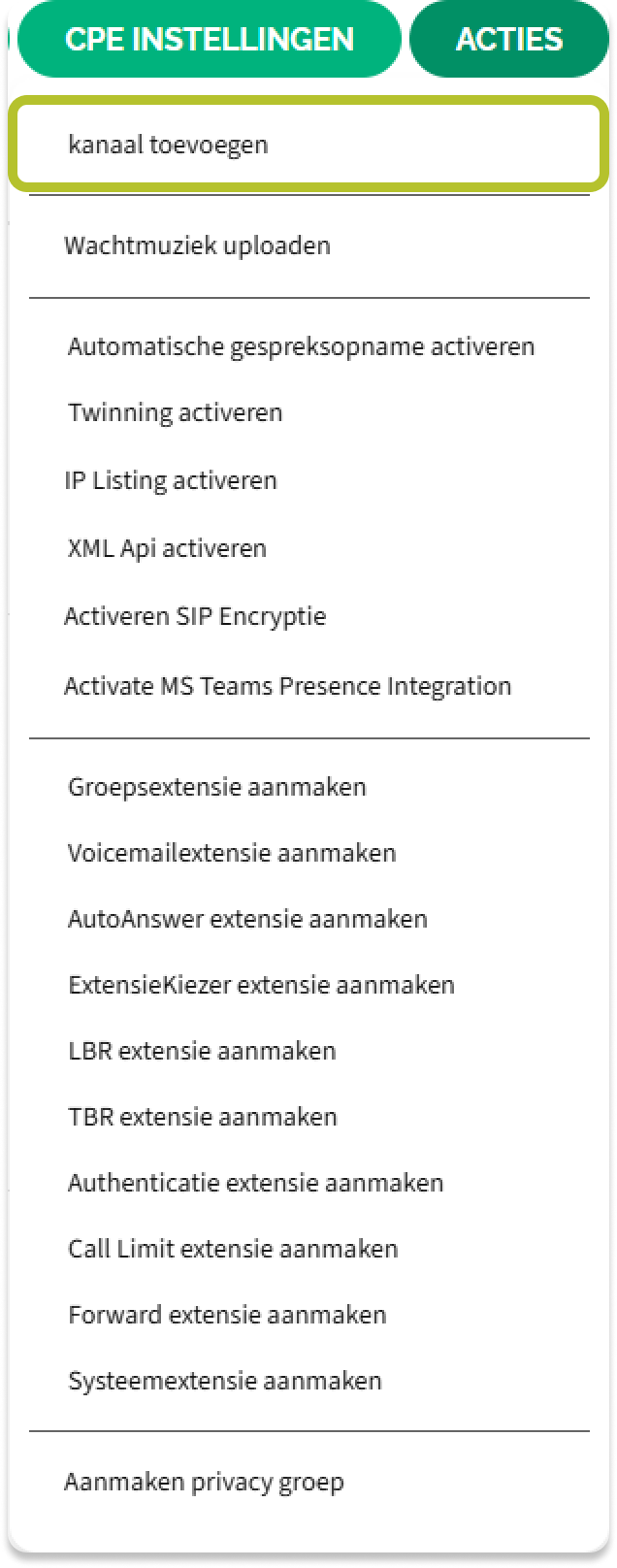Stap 3: Acties en Kanaal toevoegen Om een kanaal te kunnen toevoegen dien je eerst op Acties te klikken. Er zal een menu verschijnen waarna je vervolgens op Kanaal toevoegen moet klikken.
