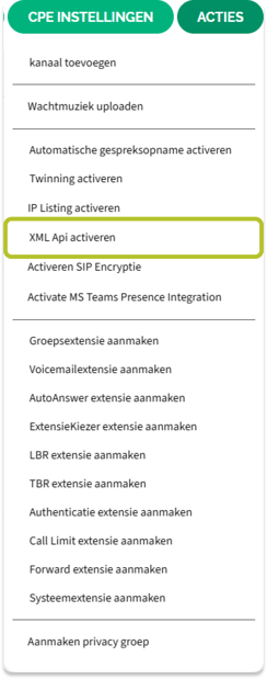 Stap 4: Acties en XML API Klik vervolgens op Acties (rechts bovenin het scherm). Voor het gebruik van de XML API functionaliteit dien je deze eerst te activeren. Dit doe je door onder de actie knop, de optie XML API activeren te kiezen. Zie afbeelding 4. |